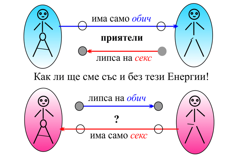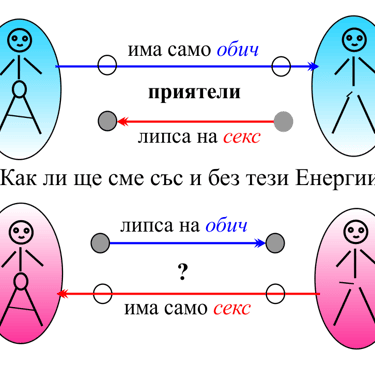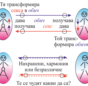 Мъжът консумира високи честоти (обич), а излъчва ниски (секс). Той не може да обича и затова я консумира!